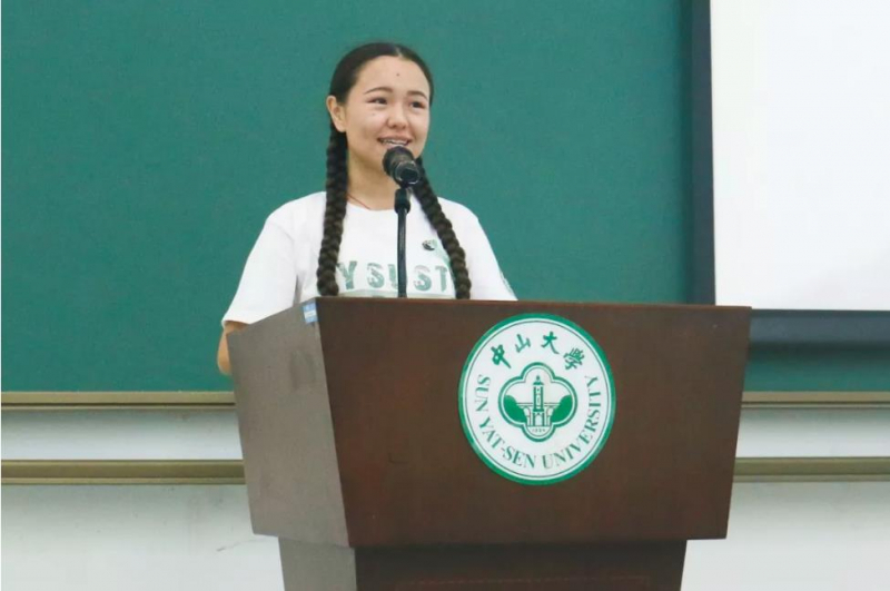 来自4162公里之外的新疆乌孜别克族学生阿合叶尔克作为新生代表,怀着自豪,向大家介绍风景宜人的故乡;载着理想,立下“学以致用,为家乡的旅游业做出贡献”的志向。她深信自己选择了最正确也是最好的专业,相信这个选择响应了习近平总书记“绿水青山就是金山银山”的号召,她也憧憬着能和所有同学一同成为德才兼备、领袖气质、家国情怀的新一代中大人!