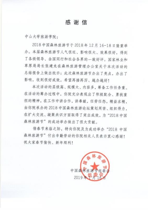 导航痕迹 首页 中国森林旅游节组委会来信感谢并高度肯定我院成功举办“2018中国森林旅游论坛” 中国森林旅游节组委会来信感谢并高度肯定我院成功举办“2018中国森林旅游论坛” 发布人:旅游学院 发布日期:2019-01-08 2019年1月16日,中国森林旅游节组委会向我院发来感谢信,感谢我院成功举办“2018中国森林旅游论坛”,高度肯定了我院的会议筹办工作。