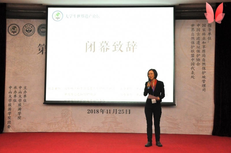 最后,中山大学旅游学院院长徐红罡教授致闭幕辞。徐红罡院长首先感谢各单位、高校对本次论坛的大力支持,感谢嘉宾的莅临与特别赞助,感谢张朝枝教授七年来为大学生世界遗产论坛作出的努力;其次表明本次论坛的跨界特点显著,即使在多方面尚未达成共识,但这正体现了此论坛的必要性;最后阐述可持续发展作为一个全球问题,遗产和旅游都是途径而非目的,提出在未来将论坛扩展到世界其他国家的发展方向与希望,从而为目的地带来真正切实可行的方案。至此,第七届大学生世界遗产论坛圆满落幕。
