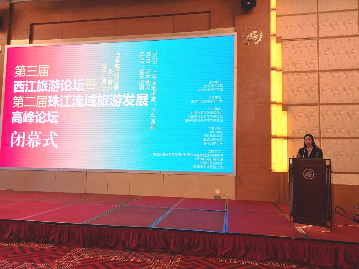 10月18日至20日,由我院和曲靖师范学院共同主办的第三届“西江旅游论坛”暨第二届“珠江流域旅游发展高峰论坛”在云南省曲靖市成功举行,来自珠江-西江流域的云南、贵州、广西、广东和全国50多所高校和旅游科研院所的180多位专家学者齐聚曲靖,以“聚焦与展望:乡村振兴与全域旅游发展”为主题,共同研讨发展思路、交流研究经验、分享研究成果。曲靖市人大常委会副主任马琼芬、副市长袁晓瑭,曲靖师范学院党委书记李永勤,肇庆学院党委副书记黄劲松,桂林旅游学院副校长王文,贵州师范大学国际旅游文化学院院长殷红梅,以及我院保继刚教授、罗秋菊副院长等出席开幕式,曲靖师范学院校长浦虹主持开幕式。