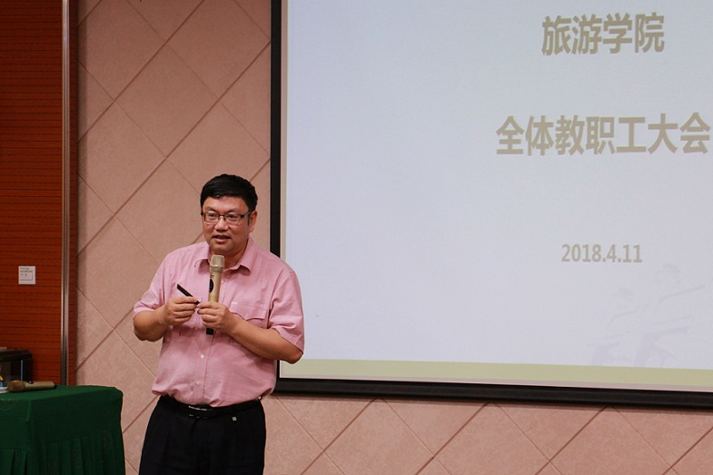 4月11日下午,旅游学院召开全体教职工大会,传达学习了学校2018年春季工作会议精神。