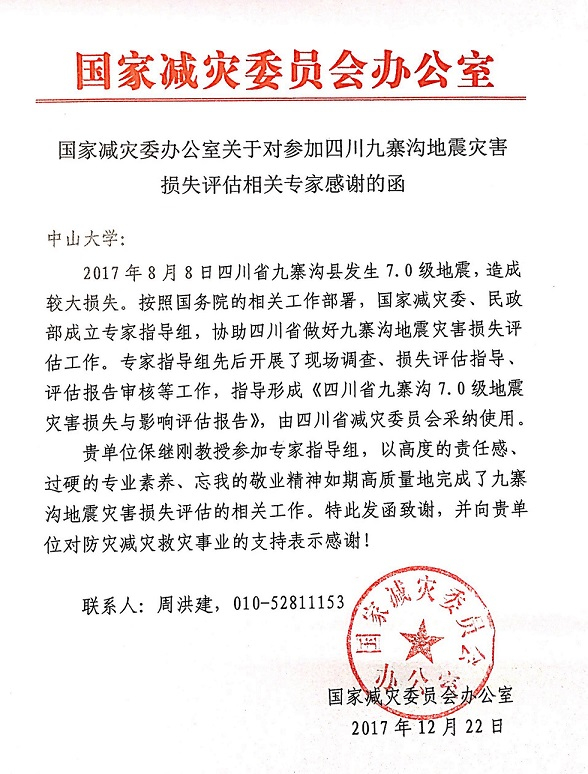 国家减灾委办公室向我校发来感谢函 感谢保继刚教授参加九寨沟地震灾害损失评估