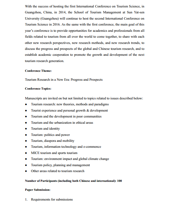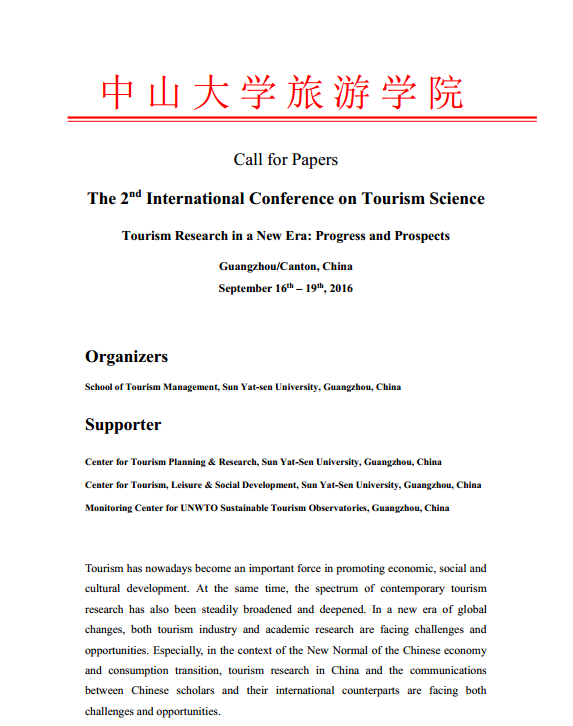 导航痕迹 首页 学术研究 学术活动 The 2nd International Conference on Tourism Science The 2nd International Conference on Tourism Science 发布人:旅游学院 发布日期:2016-03-18