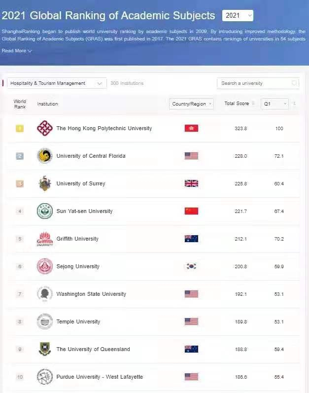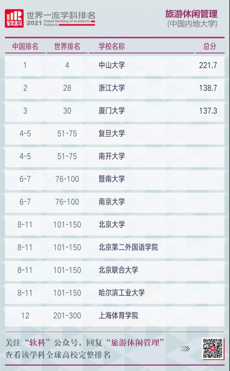 2021软科丨中山大学旅游休闲管理学科排名继续位列全球第4,中国内地第1!