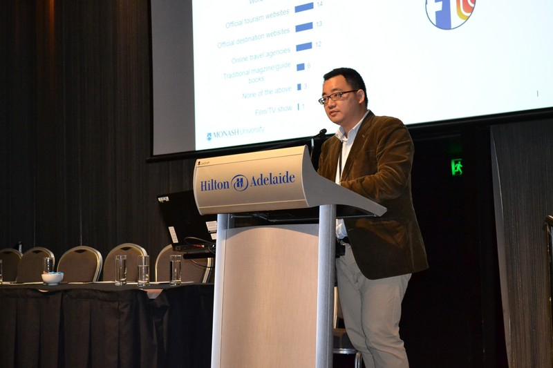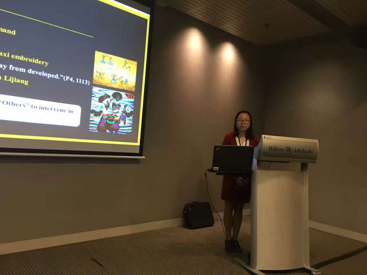 当天下午,陈钢华副教授、左冰副教授分别主持了“中国游客目的地感知”“游客行为与体验”两场分组论坛,我院参会师生分别在各分组论坛中做了发言。罗秋菊教授在“社交媒体与旅游”为主题的分组论坛中发表题为“Research on the dissemination structure and effects of tourism destination information in social media”的分组汇报;基于微信与微博社交媒体,运用社交网络分析法分析了旅游目的地信息传播结构和效果。陈钢华副教授在“游客行为与体验”为主题的分组论坛中发表题为“Understanding Chinese cultural tourists:Segments and profiles”的分组发言;运用聚类分析、判别分析以及卡方检验,根据文化中心性以及深度文化体验,将中国文化游客进行分类,为目的地营销及管理提供借鉴。Fleur Fallon老师在“旅游管理”为主题的分组论坛中发表题为“Following in the footsteps of President Xi: Chinese tourists in Tasmania”的分组发言。博士后袁宏舟在“社交媒体与旅游”为主题的分组论坛发表题为“The study of the influence of crisis incidents to destination image of HK in self-media age”的分组发言。以“香港强迫购物”事件和“占中”事件为例,从传播学角度深入剖析自媒体时代危机事件对香港旅游产业的影响。