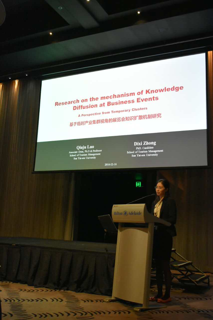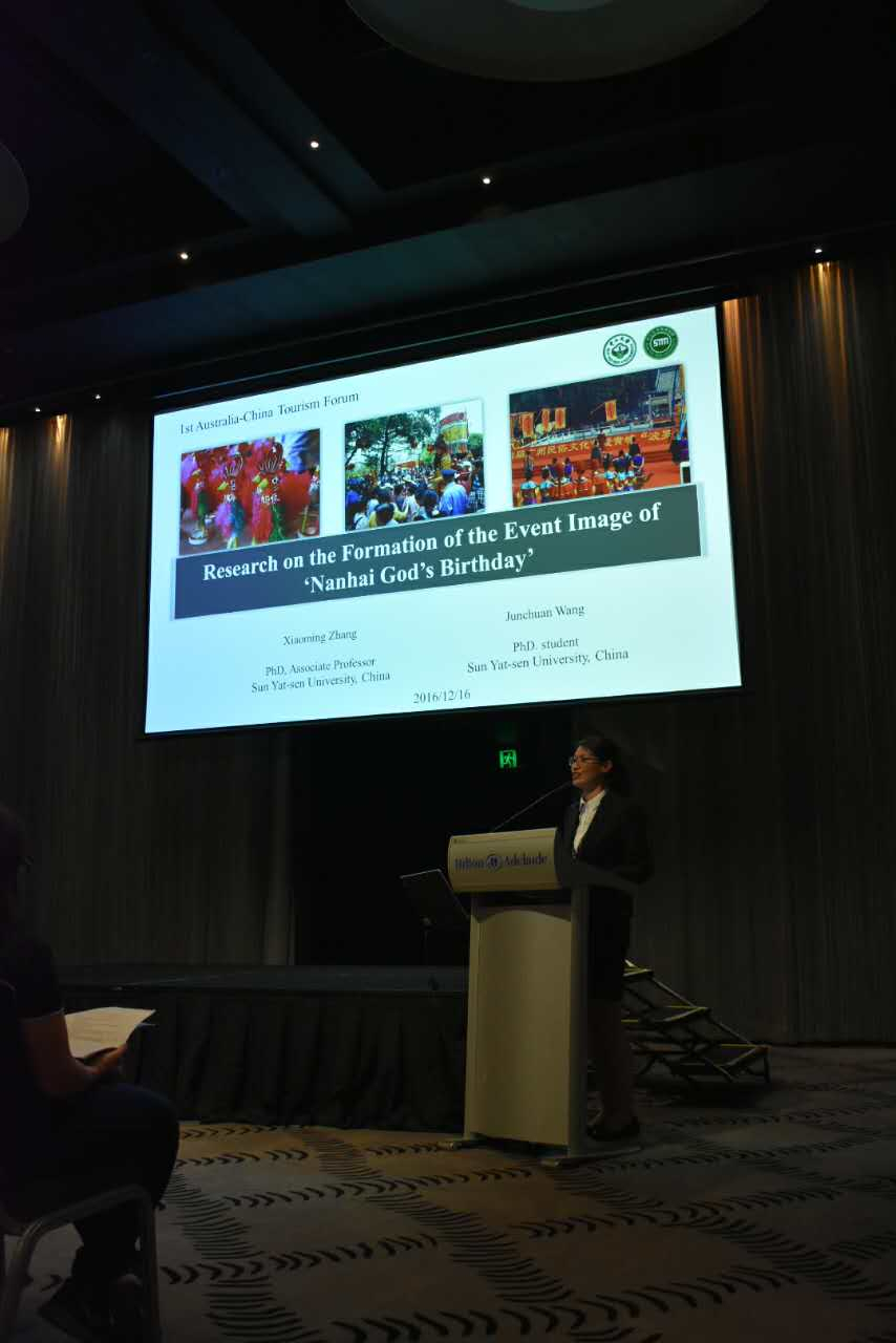 2016年12月15至17日,第一届澳中旅游论坛(1st Australia-China Tourism Forum)于澳大利亚阿德莱德市希尔顿酒店成功召开。该论坛由南澳大学管理学院、中山大学旅游学院、科廷大学旅游研究中心联合主办,旨在邀请中澳两国的学术精英、行业先锋、政府官员齐聚一堂,分享他们关于中澳两国旅游关系发展的真知灼见。本次会议主题为“通过旅游加强澳中人民文化联系:展望未来的经济关系(Strengthening Australia-China people and cultural link though tourism: Looking beyond economic ties)”。中山大学旅游学院副院长罗秋菊教授、孙九霞教授、左冰副教授、陈钢华副教授、Fleur Fallon老师、博士后袁宏舟、博士研究生王骏川、钟迪茜、硕士毕业生现就读UTS陈婉欣及硕士研究生许泳霞、凌玲等一行11人出席本次会议。来自中国、澳大利亚、新西兰、中国香港等多个国家和地区的92名代表出席此次会议。
