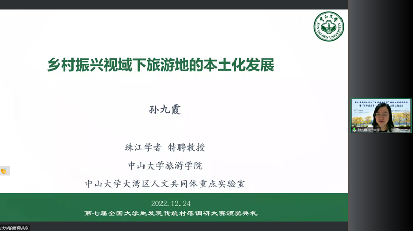 在颁奖仪式的最后,孙九霞教授进行了闭幕致辞,对本次大赛的成果进行总结,强调青年走入传统村落既是认识乡土的过程,更是自我认识的过程,具有重要的意义,并向支持大赛的高校、组织及媒体的长期支持表示感谢。