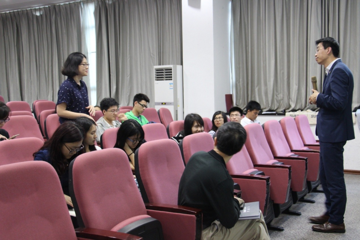 李刚教授就本项目做了全方位客观的介绍。李刚教授分别对英国萨里大学的办学背景、发展历程、地理位置、校园环境、排名情况、国际影响力、学科建设、学生就业、生活花费等方面进行了总体介绍,对报名流程做了详细说明。在本项目中,萨里大学的三个学院为我院学生开放,三个学院分别是:酒店与旅游管理学院(School of Hospitality & Tourism)、萨里商学院(Surrey Business School)以及经济学院(School of Economics)。侯远思博士具体介绍了三个学院的专业情况,包括各专业所设置的方向与课程、学习制度与毕业要求、考评标准、专业特色、学费与奖学金情况。
