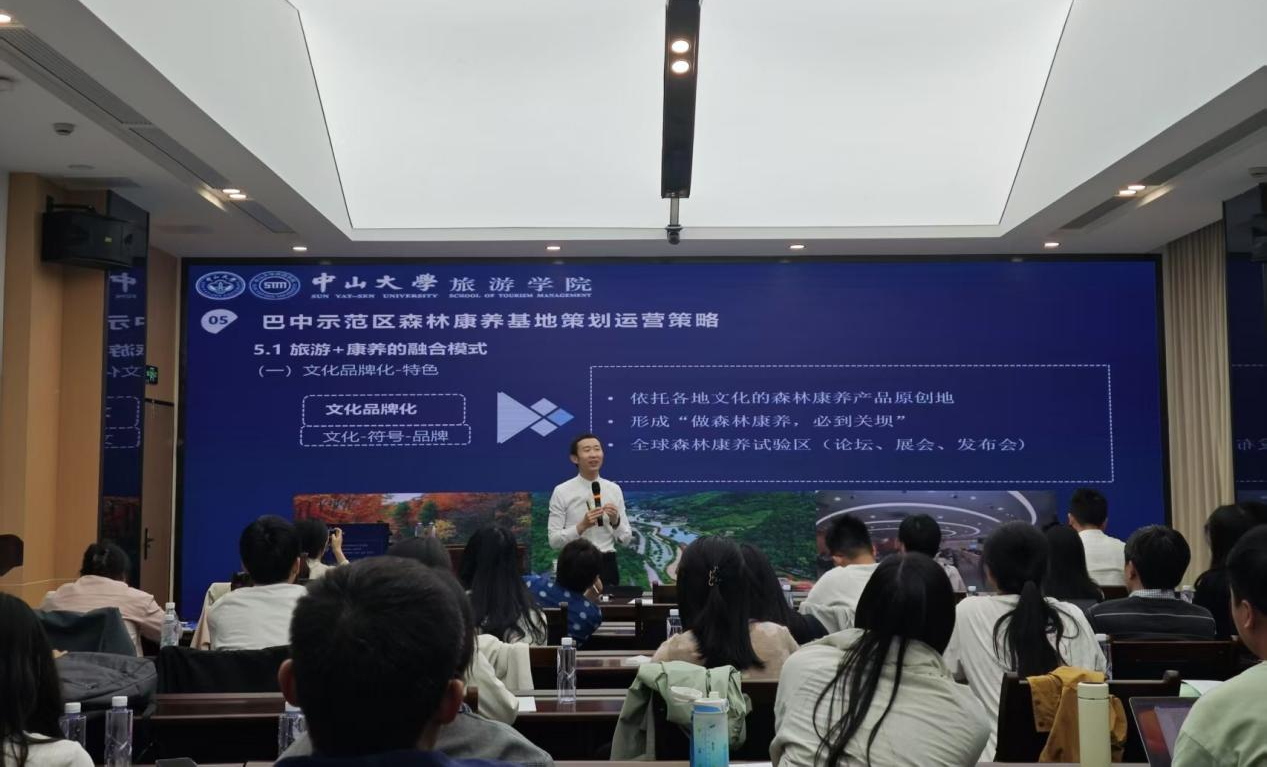 在集中授课中,何莽副教授开展“气候型森林康养资源的业态培育与产业开发”主题授课,余晓娟副教授针对巴中文旅示范区各景区现状,对比国内外优秀旅游目的地,探讨了如何系统性构建高质量旅游解说体系。陈奕滨老师结合光雾山体育旅游产品发展现状,从体育旅游的概念,产品体系等方面进行讲解。