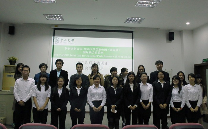 12月15日晚上,伊利诺伊大学-中山大学国家公园(张家界)国际联合实验室(以下简称“实验室”)2015年学生科研实践项目研究成果展示会在中山大学旅游学院讲学厅举行。学院张朝枝教授、刘逸老师、赵莹老师、张辉老师和郝小斐老师出席了本次展示会。我院2012级、2013级部分本科生和部分研究生参加了大会。