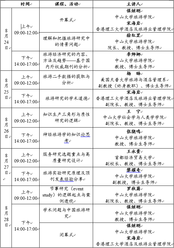 本届旅游管理博士学术训练营共持续5天(2020年8月24–28日),主要学术活动包括旅游研究学术训练系列讲座、博士生的研究设计指导、旅游研究热点及难点问题的网络会议讨论、论文写作指导等。学术讲座的内容及时间安排详见下表,敬请关注!